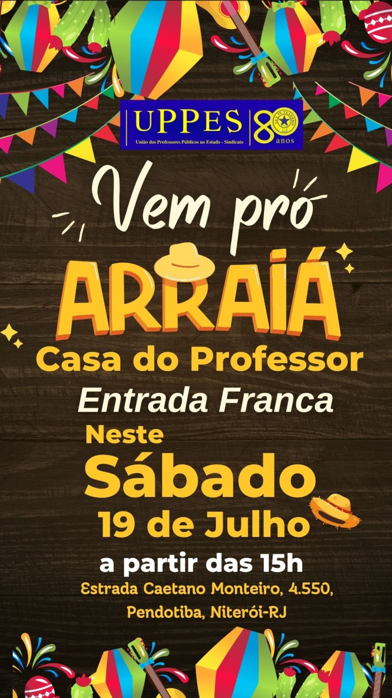 A tradicional festa junina da União dos Professores Públicos no Estado – Sindicato (UPPES) retorna com força total em 2025. O evento acontece no próximo sábado, 19 de julho, a partir das 15h, na Casa do Professor, localizada na Estrada Caetano Monteiro, 4.550 – Pendotiba, Niterói. A entrada é franca e aberta a todos os públicos.