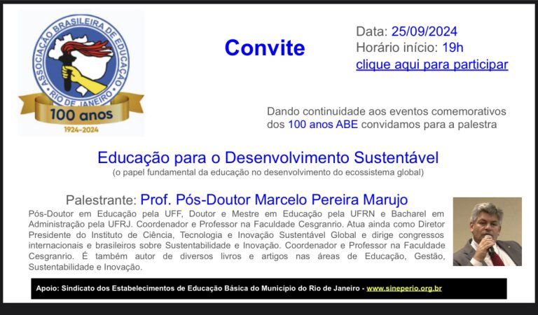 “Educação para o Desenvolvimento Sustentável: Desafio à Sociedade do Conhecimento” será o tema da live que acontecerá no dia 25 de setembro, às 19h, com a participação do professor Marcelo Pereira Marujo. O evento faz parte das comemorações do Centenário da Associação Brasileira de Educação (ABE) e será mediado por Pedro Flexa Ribeiro, Vice-presidente do Sinepe Rio e membro da ABE.