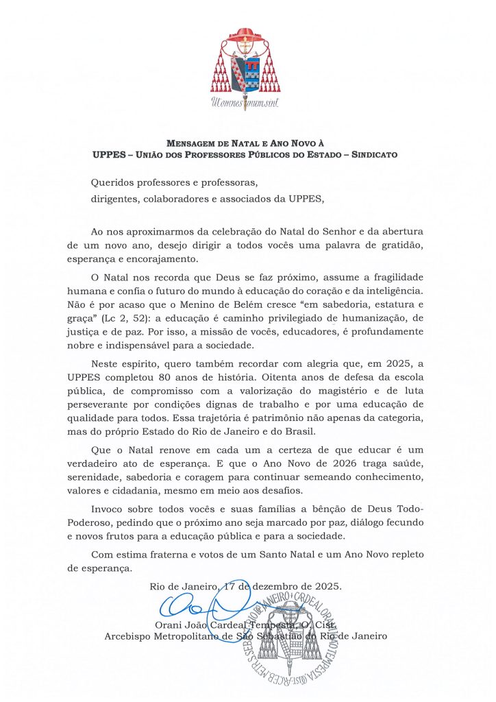 MENSAGEM DO CARDEAL DOM ORANI TEMPESTA PARA A UPPES