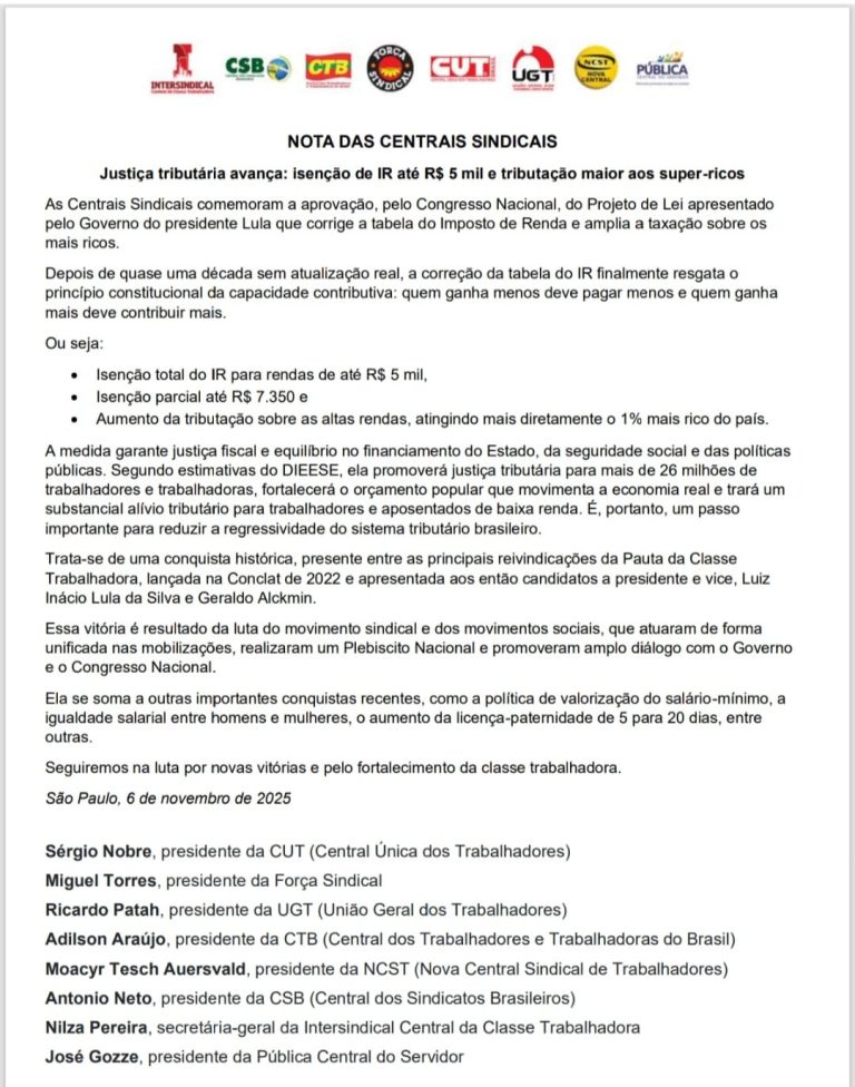 NOTA DAS CENTRAIS SINDICAIS – JUSTIÇA TRIBUTÁRIA