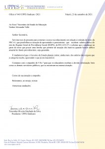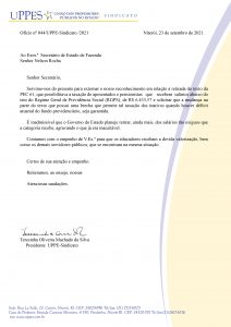 A UPPE-Sindicato encaminhou às autoridades estaduais ofício solicitando a retirada de pauta da taxação de aposentados e pensionistas que recebem a partir de um salário mínimo. O sindicato já havia emitido nota de repúdio acerca do tema. O ofício foi encaminhado ao presidente do Rioprevidência, Sérgio Aureliano, e ao secretário de Fazenda, Nelson Rocha, bem como para o secretário estadual de Educação, Alexandre Valle.