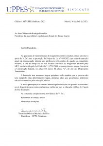 A UPPE-Sindicato encaminhou a parlamentares da Assembleia Legislativa do Estado do Rio de Janeiro (Alerj) ofício solicitando apoio dos deputados na aprovação do Projeto de Lei nº 483/2023, que estabelece a correção anual da remuneração mínima dos professores integrantes do quadro do magistério público estadual, a fim de adequá-la ao Piso Salarial Nacional do Magistério definido pelo MEC, estabelecido pela Lei Federal no 11.738/2008. No documento, a presidente da UPPES, Teresinha Machado da Silva, destaca que a Educação possui recursos e regras que não têm sido cumpridas pelo governo. O documento foi encaminhado ao deputado Rodrigo Barcellar, presidente da Alerj, bem como aos seguintes deputados: