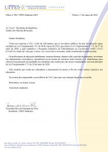A UPPE-Sindicato encaminhou ofício ao presidente da República, Jair Messias Bolsonaro, solicitando a inclusão dos professores na Lei Complementar 191, de 08 de março de 2022, que altera a Lei Complementar nº 173, de 27 de maio de 2020, a qual estabelece o Programa Federativo de Enfrentamento ao Coronavírus SARS- CoV-2 (Covid-19). De acordo com o documento, o texto  fere a isonomia, sendo considerado inconstitucional.