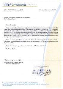 A União dos Professores Públicos no Estado-Sindicato (UPPES) questionou, através de ofício, o percentual de 5,9% anunciado, na última segunda-feira (12/12), pelo governador Cláudio Castro. No documento, a presidente da UPPES, Teresinha Machado da Silva, afirma acreditar que o percentual divulgado nada tem a ver com os 26,11% previsto na Lei 9.436, publicada em 14 de outubro de 2021, cuja reposição foi referente ao IPCA acumulado entre setembro de 2017 e dezembro de 2021, que começou a ser cumprida, em janeiro deste ano e que deverá ser paga em três parcelas (2022, 2023 e 2024).