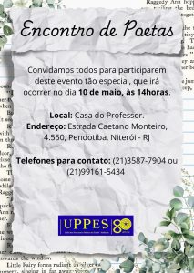 No dia 10 de maio, às 14h, o Departamento de Biblioteca e Criatividades da UPPES promoverá o 1º Encontro de Poetas, na Casa do Professor, em Pendotiba, Niterói-RJ, com entrada franca. A unidade que é a subsede de hospedagem, cultura e lazer do sindicato terá uma tarde cultural com poesia e música, além de diversas atrações especiais.